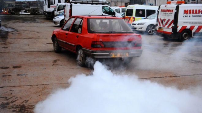Simon Chaplin, 62, from Hebron, flicked a switch in his Peugeot 309 near Haverfordwest, Pembrokeshire to release a "colossal" amount of exhaust smoke.